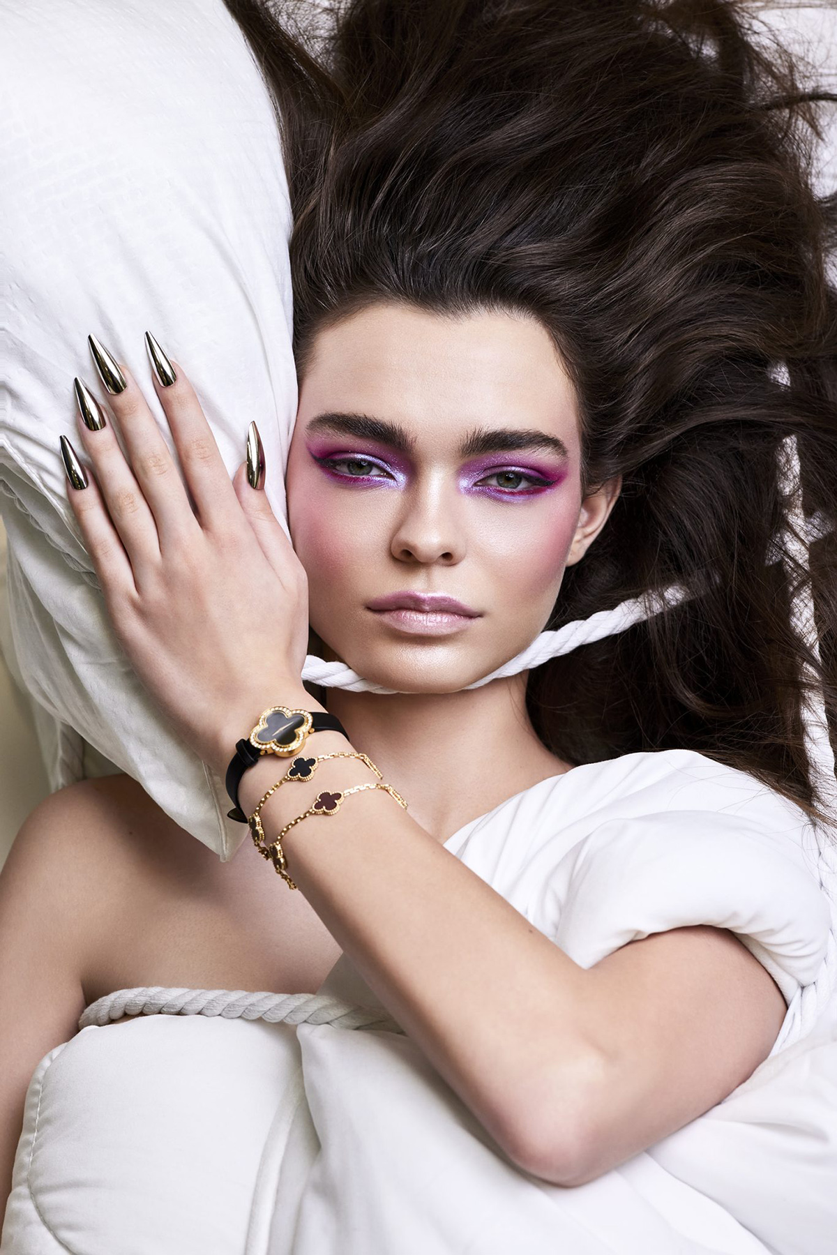 Silhouetted against snowy white linen sheets and silken cords, the model gazes at us with intensity. The striking impact of these visuals raises questions we cannot ignore.