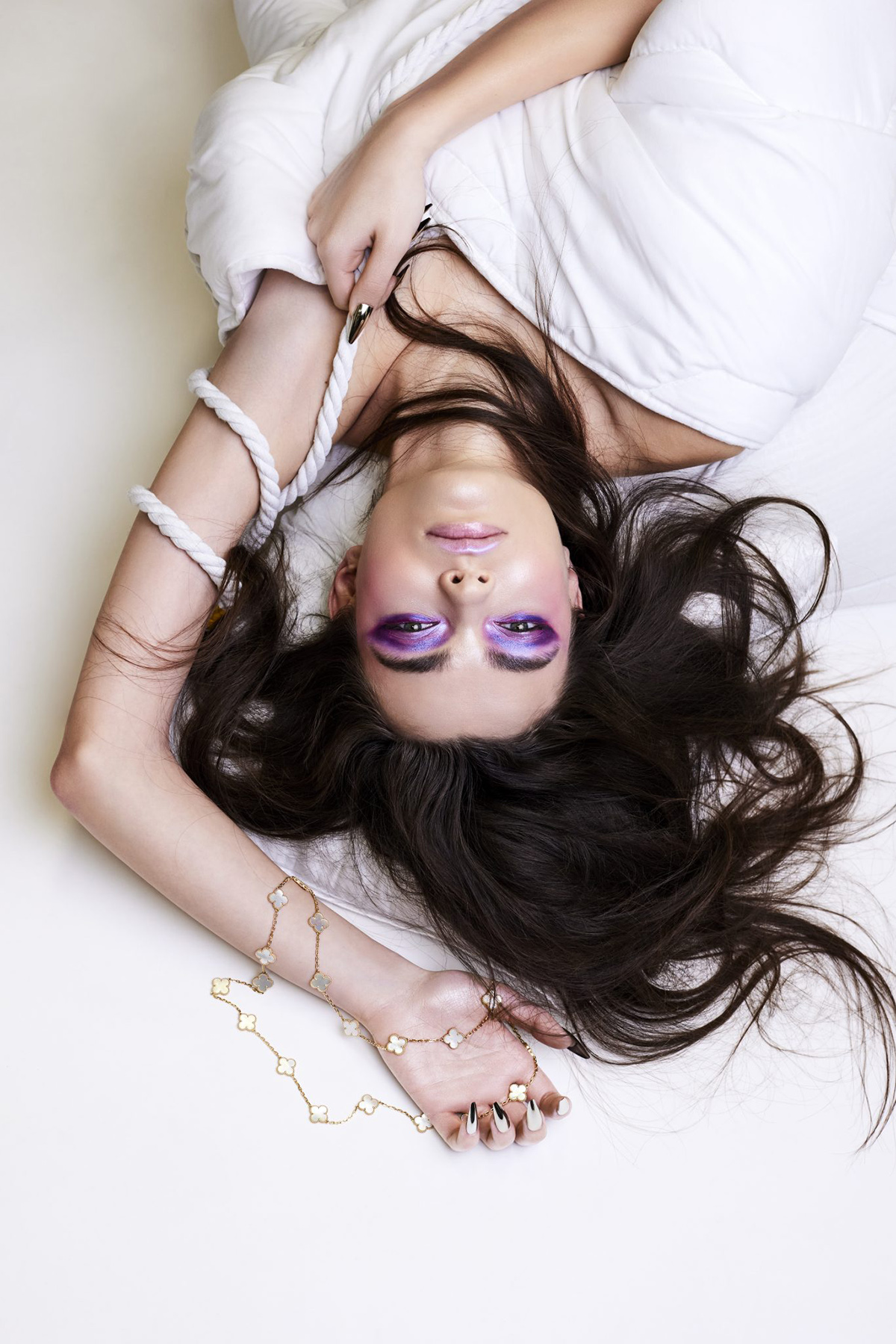 In controluce su candide lenzuola di lino e corde di seta, la modella ci fissa con intensità. L’impatto straordinario di queste immagini solleva domande che non possiamo ignorare.