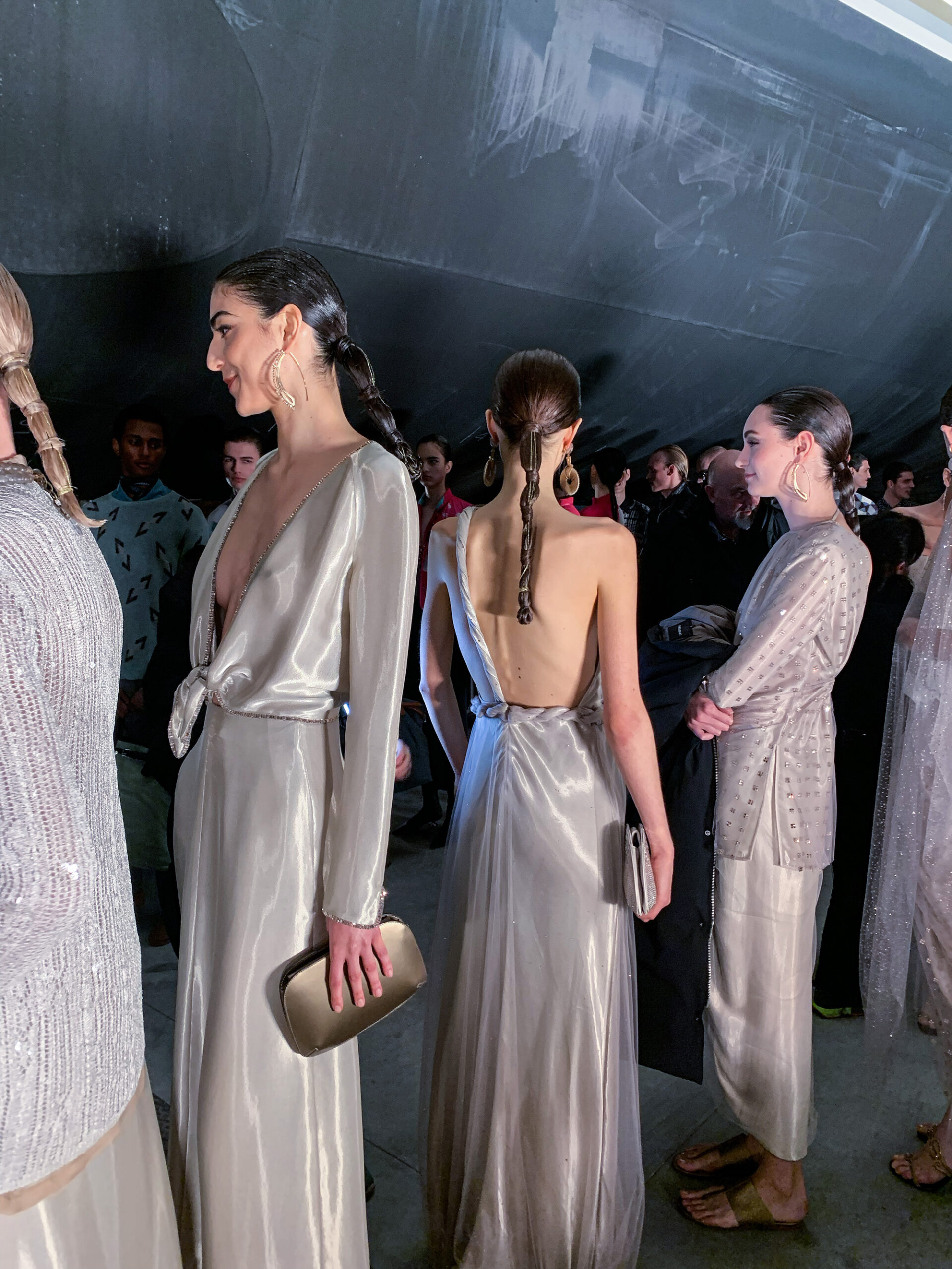 Le acconciature, leggere e naturali ma tecnicamente impeccabili, hanno accompagnato le silhouette estive con armonia. Il trucco ha puntato su una bellezza luminosa e pulita, valorizzando l’identità elegante e sobria tipica di Giorgio Armani.