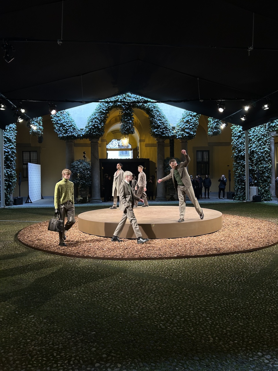 Corneliani SS25: Eleganza Contemporanea e Gesti Simbolici nel Chiostro di Palazzo Durini