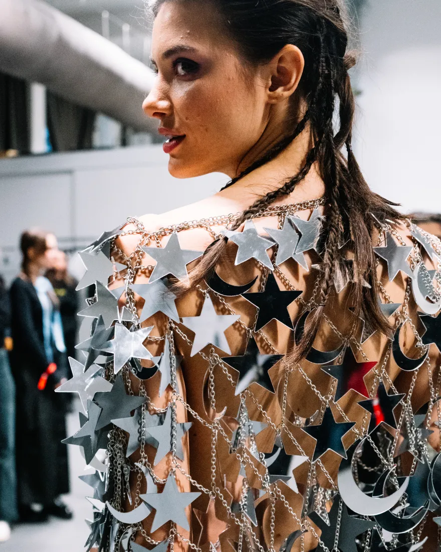 Emporio Armani porta in passerella una donna che brilla come una costellazione, ispirata alla poesia di un cielo notturno punteggiato di stelle e dominato da una luna intensa. Una visione eterea ma concreta, dove eleganza e forza convivono in equilibrio perfetto.