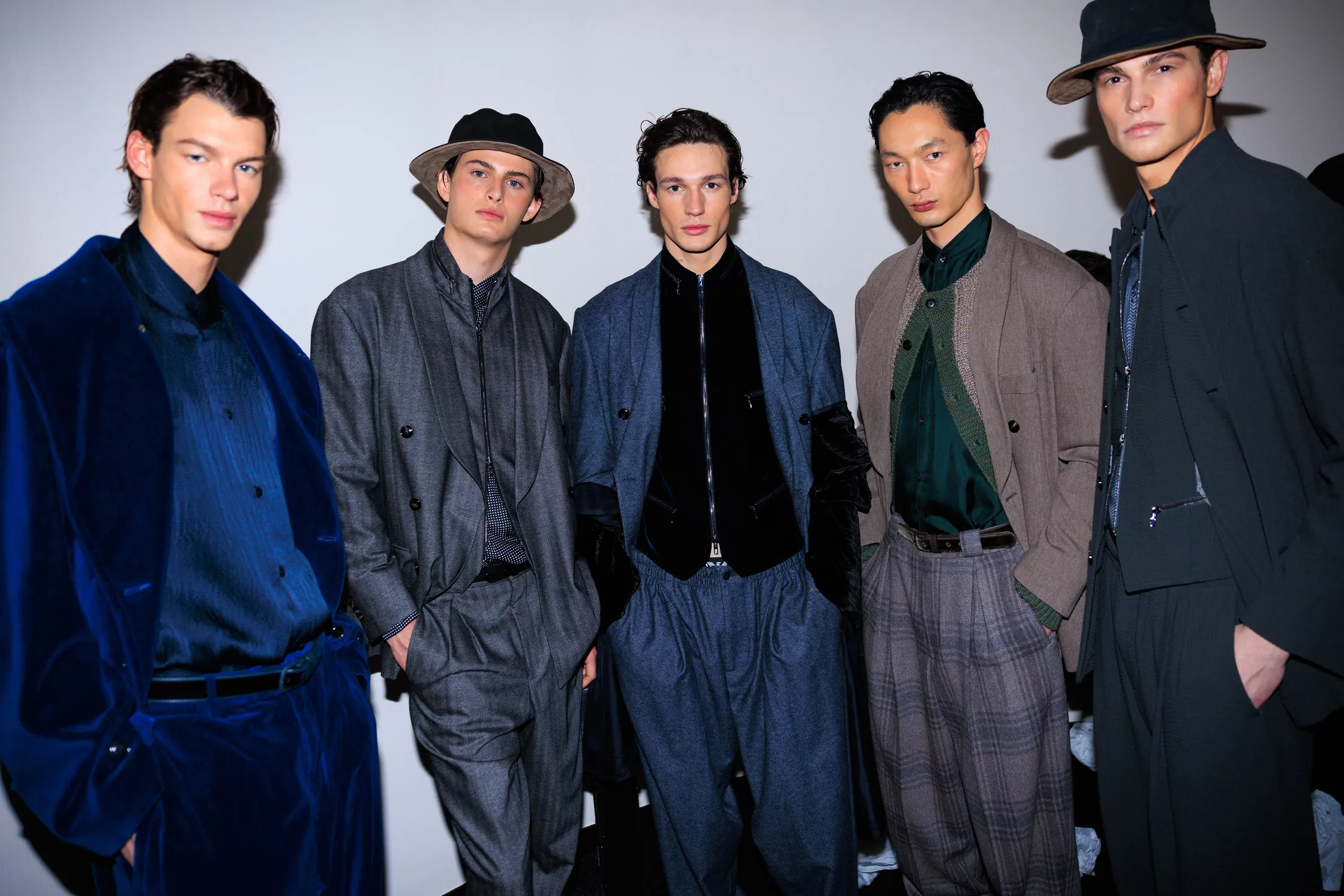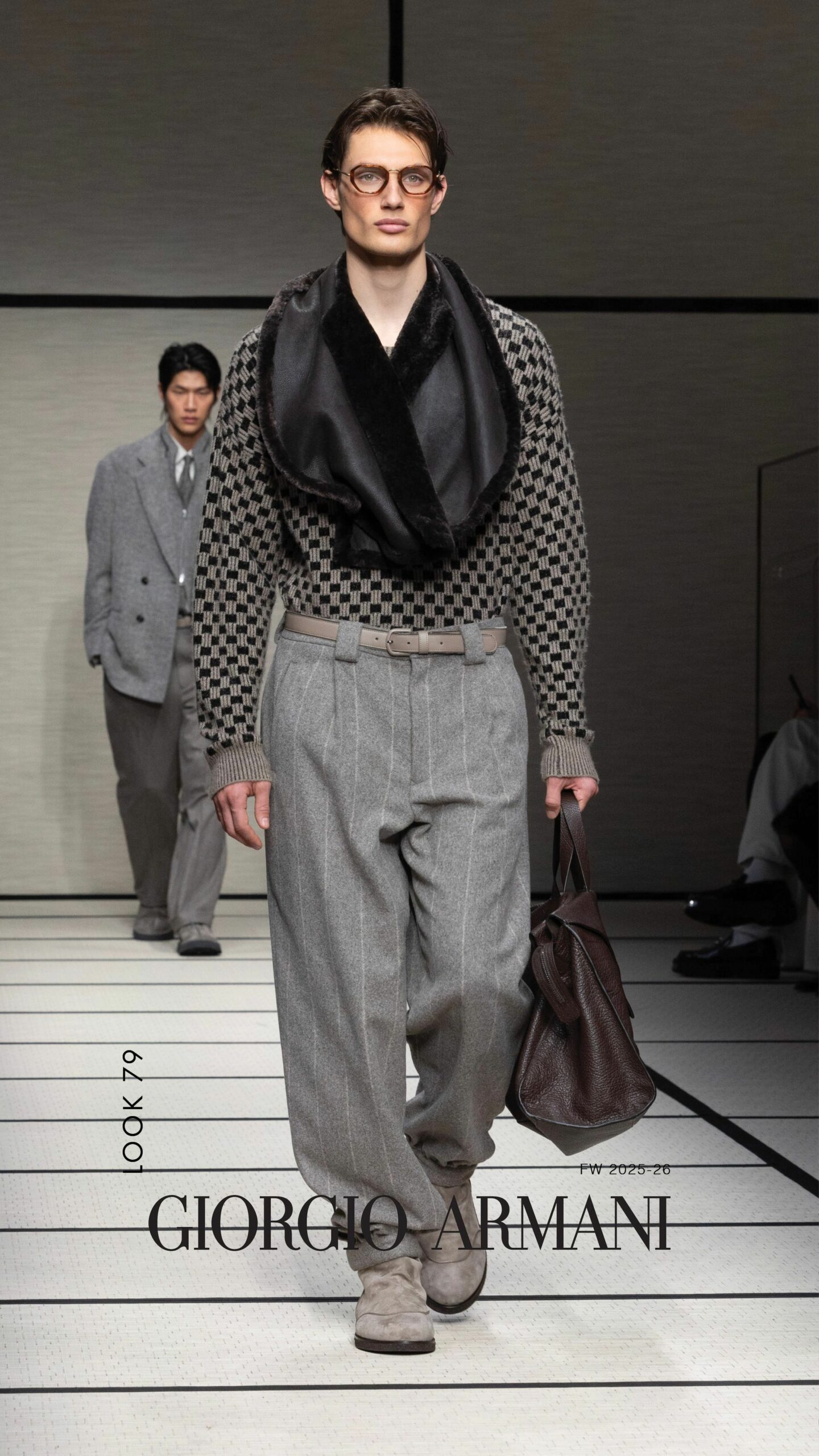 To complement the menswear, Cristiana Ceccarelli creates a makeup look that embodies understated sophistication. The skin appears healthy and sun-kissed, with subtle touches of light-reflecting highlights. This refined approach to masculine beauty underscores every facial line, blending seamlessly with Armani’s aesthetic of quiet confidence.