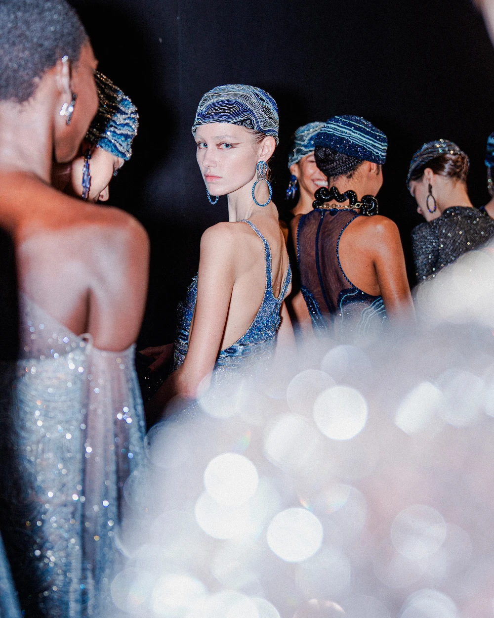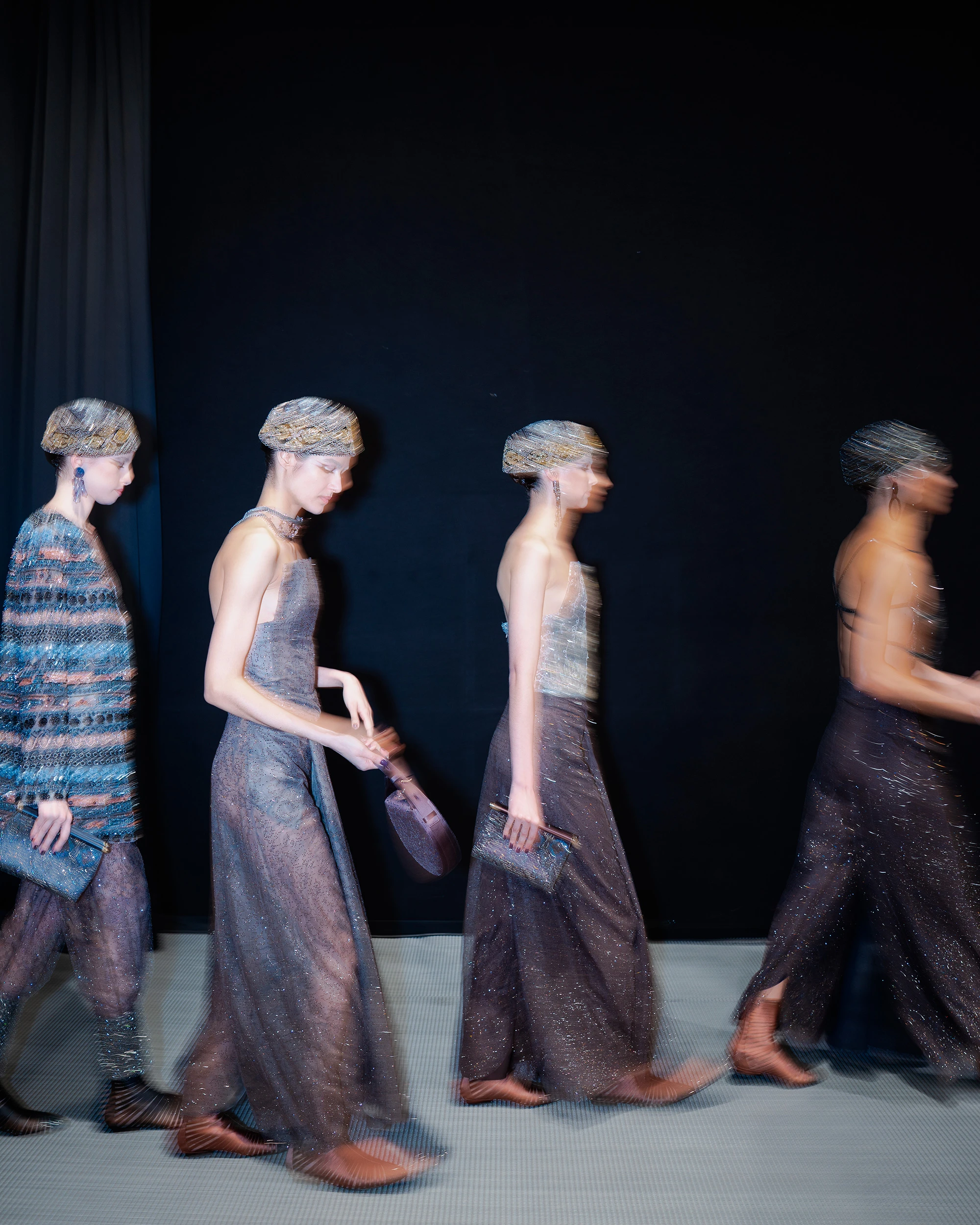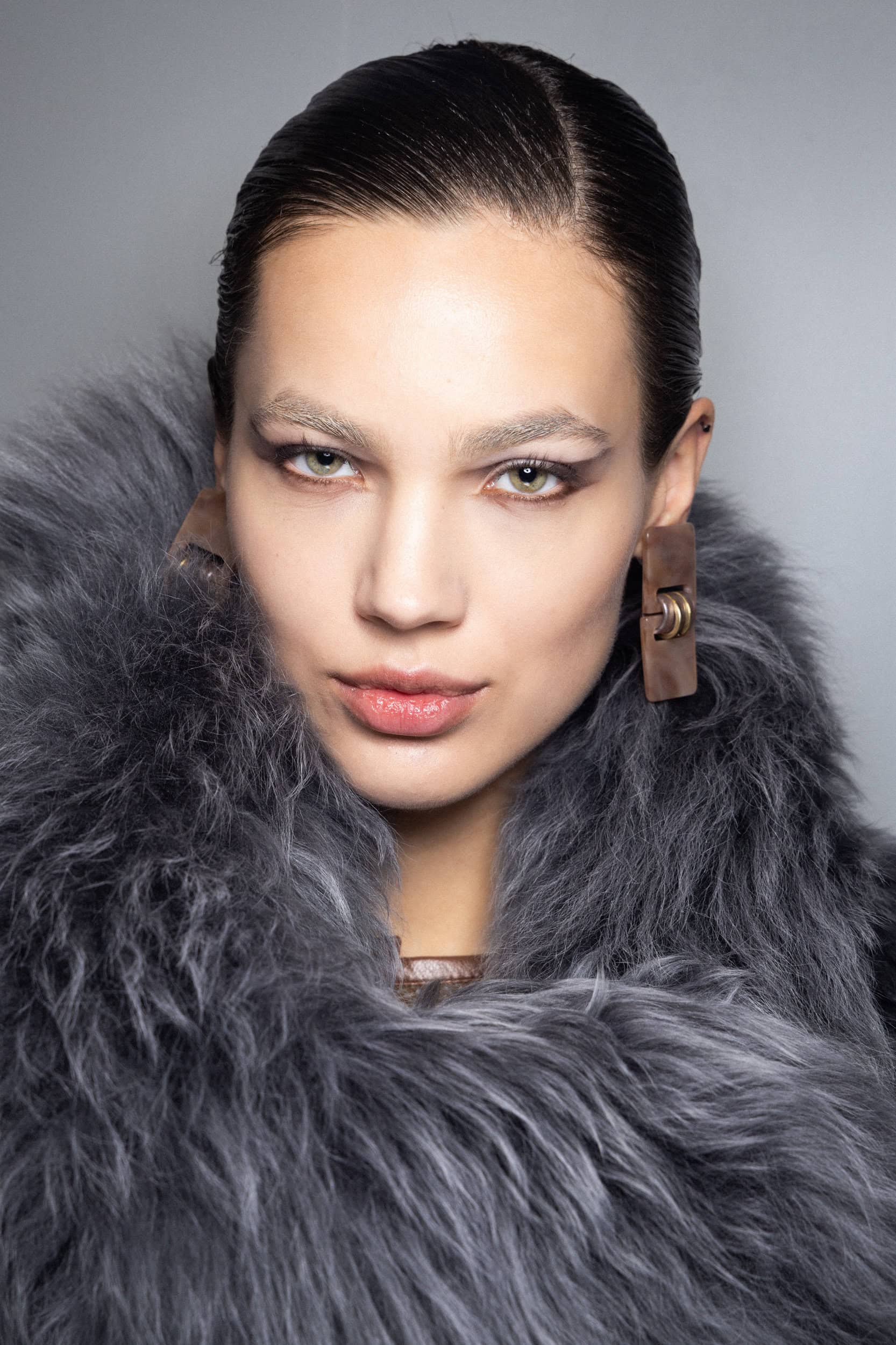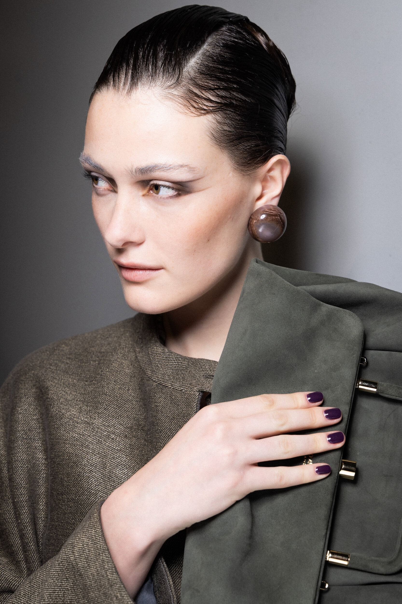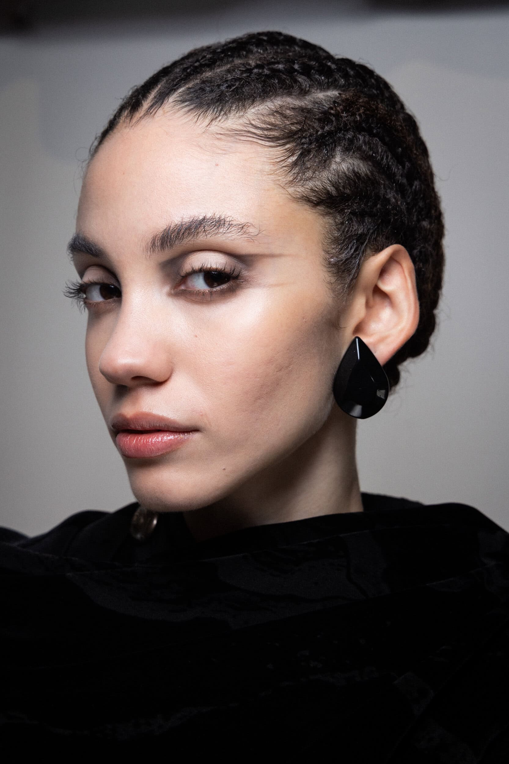 The hair, styled by Roberta Bellazzi and the team from The Agency Aldo Coppola, is gathered, braided, and sculpted, creating small, harmonious shapes that enhance the purity of Armani’s style.