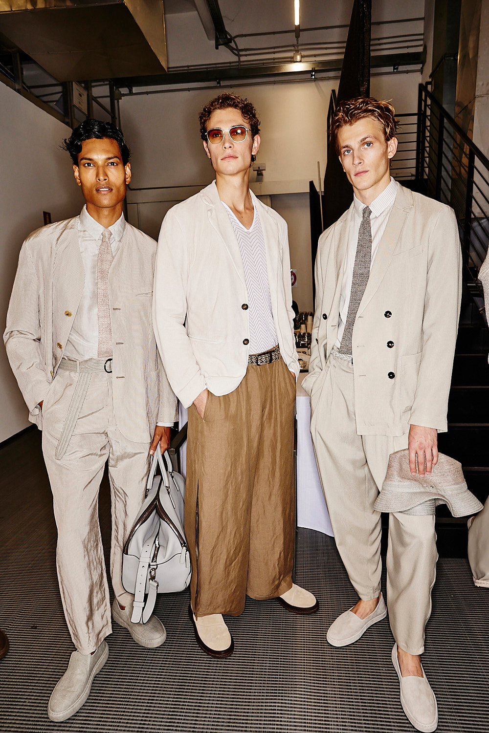 Hair, styled by Roberta Bellazzi of The Agency Aldo Coppola, flows freely and naturally. No rigid constructionsâjust clean cuts and airy textures. The result is a relaxed and effortless look, echoing the idea of authenticity and balance at the heart of Armaniâs aesthetic.