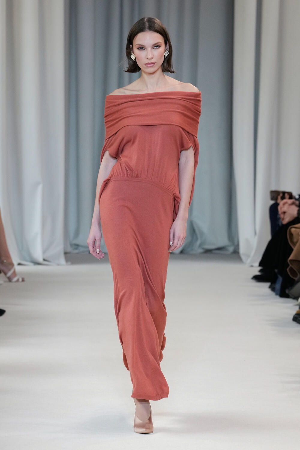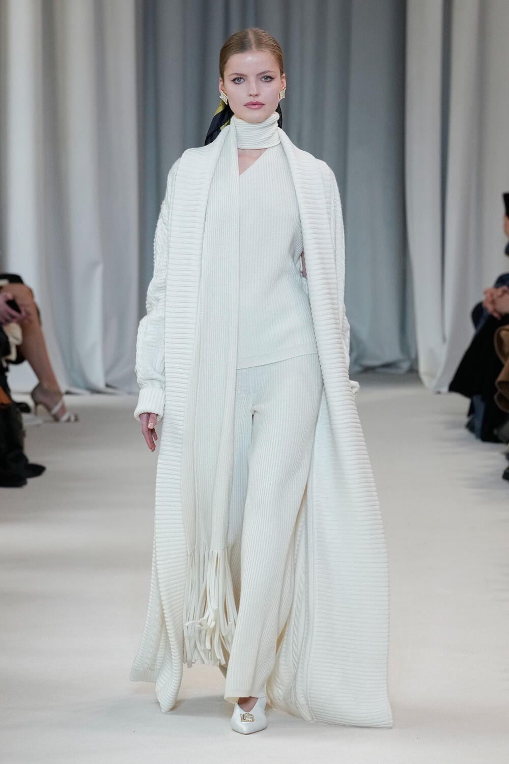 Laura Biagiotti Fall/Winter 25/26 takes the stage in the heart of Milan, at the Piccolo Teatro Grassi, celebrating the brandās bond with the city and its rich history. An emotional return to a symbolic location in Milanās āliving room,ā steeped in art and culture. The spotlight is on cashmere, the undisputed protagonist, enhancing the silhouettes with comfort and lightness. Completing the look are hairstyles by Roberta Bellazzi and the team from The Agency Aldo Coppola: perfectly sleek ponytails with a natural, soft touch, adorned with silk scarves. Makeup by Cristiana Ceccarelli expresses ethereal elegance: brown eyeliner, radiant skin, and apricot lips create a fresh and sophisticated effect. Attention to detail also extends to the nails, perfectly in tune with the collectionās refined aesthetic.