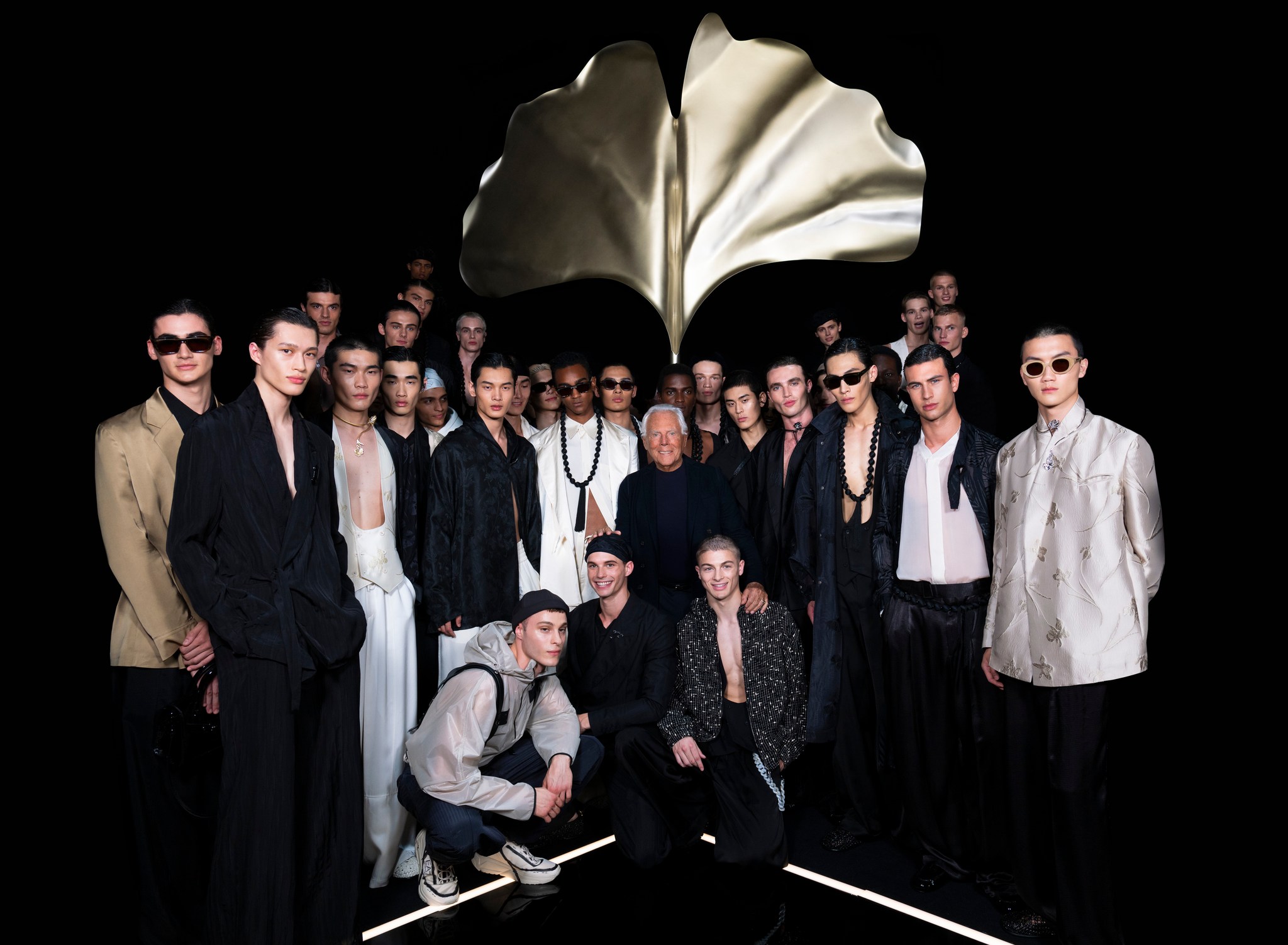 All’ombra del fiore di ginkgo biloba, in una notte illuminata dal chiaro di luna, ha sfilato la collezione Uomo Emporio Armani primavera estate 2024.