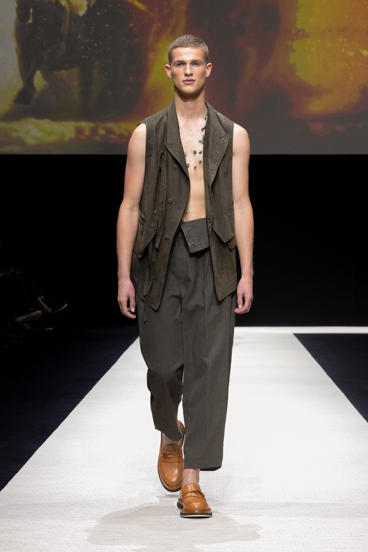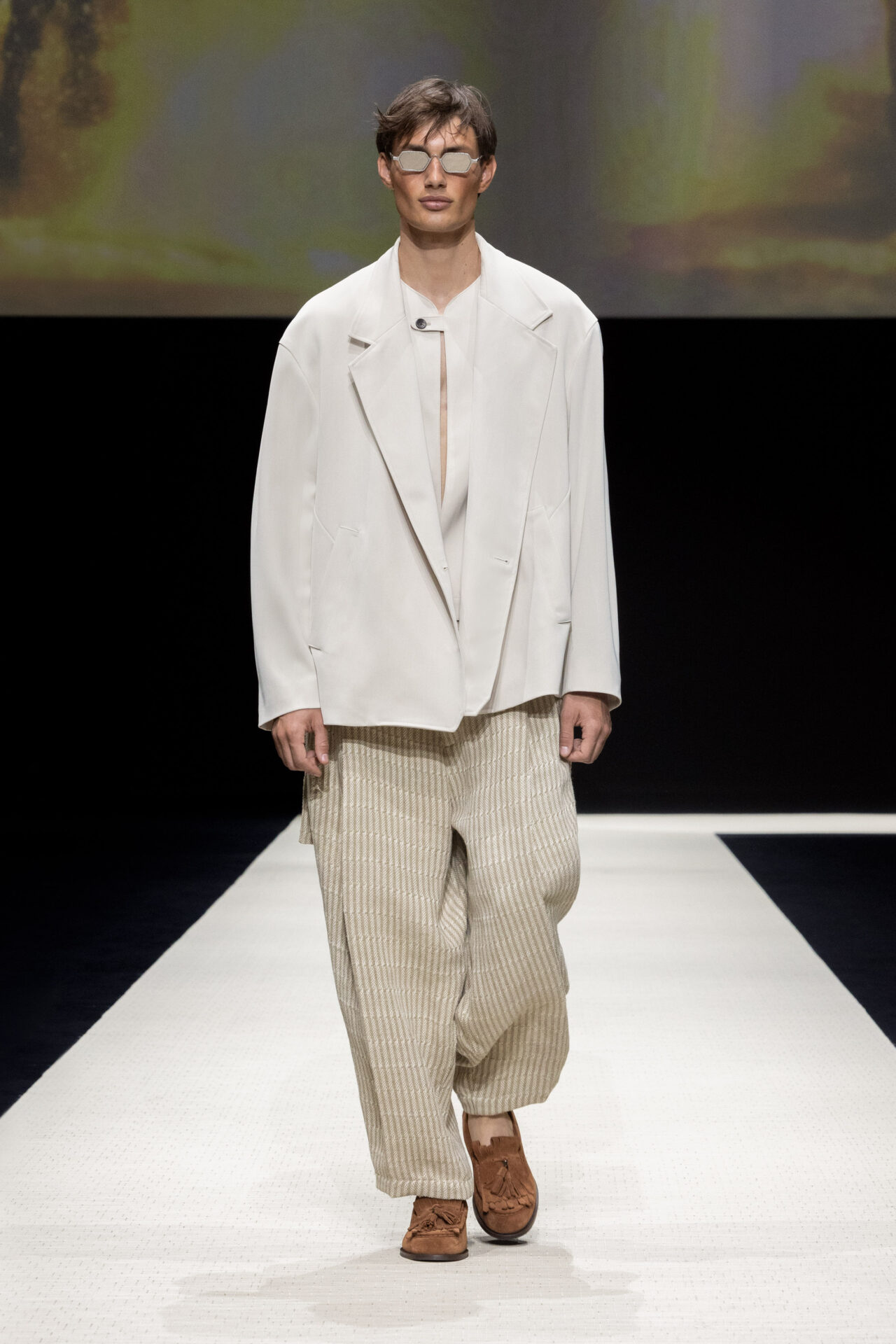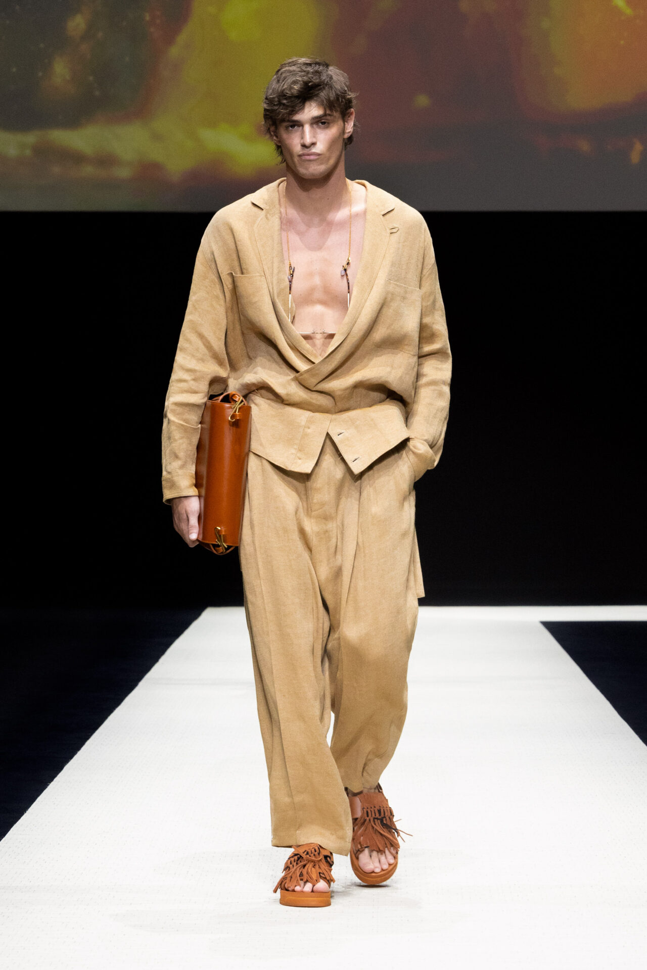 The Emporio Armani Spring/Summer 2025 collection is dedicated to the man who abandons the frenetic life of the city to return to the origins, to a contact with nature that is symbiosis and the beginning of everything.